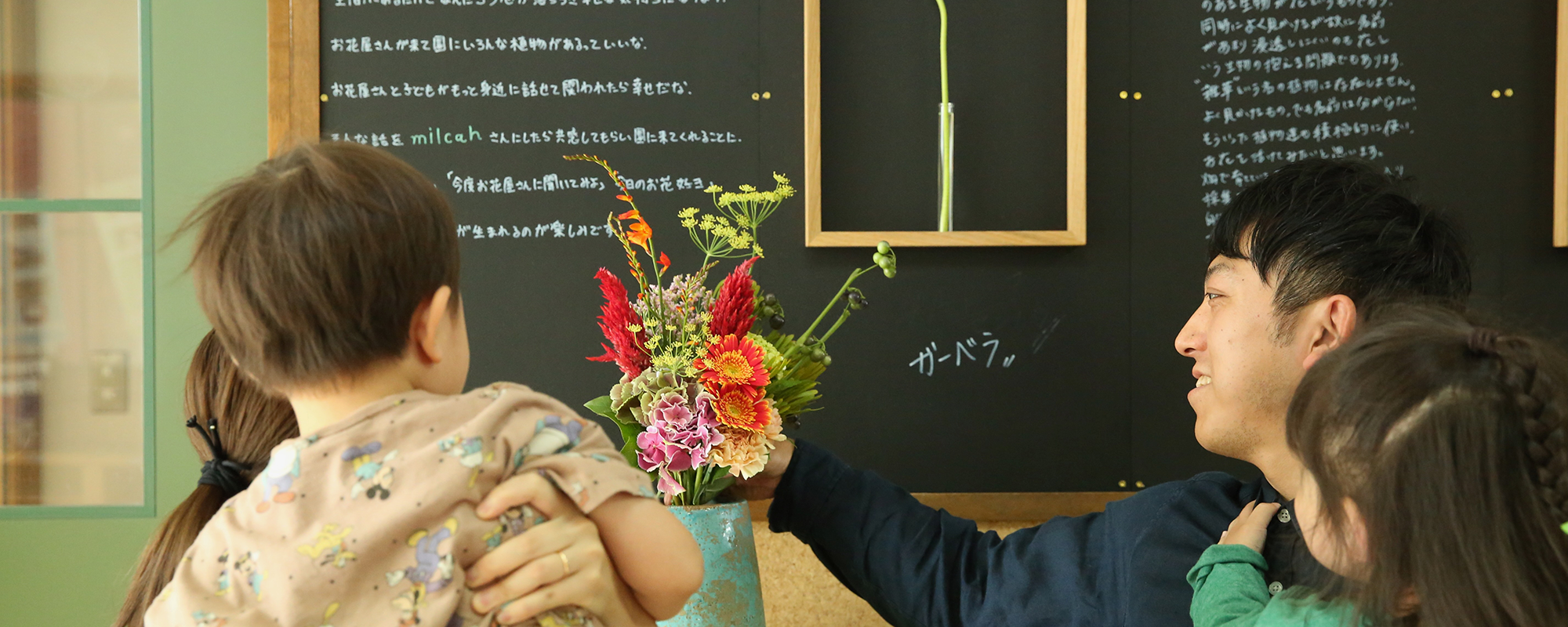園ではお花屋さんが毎週玄関に花を生け込みにきてくれたり、美味しい食パンを子どもたちの為に作ってくれるパン屋さん、地域の伝統菓子をおやつに提供してくれる和菓子屋さん。